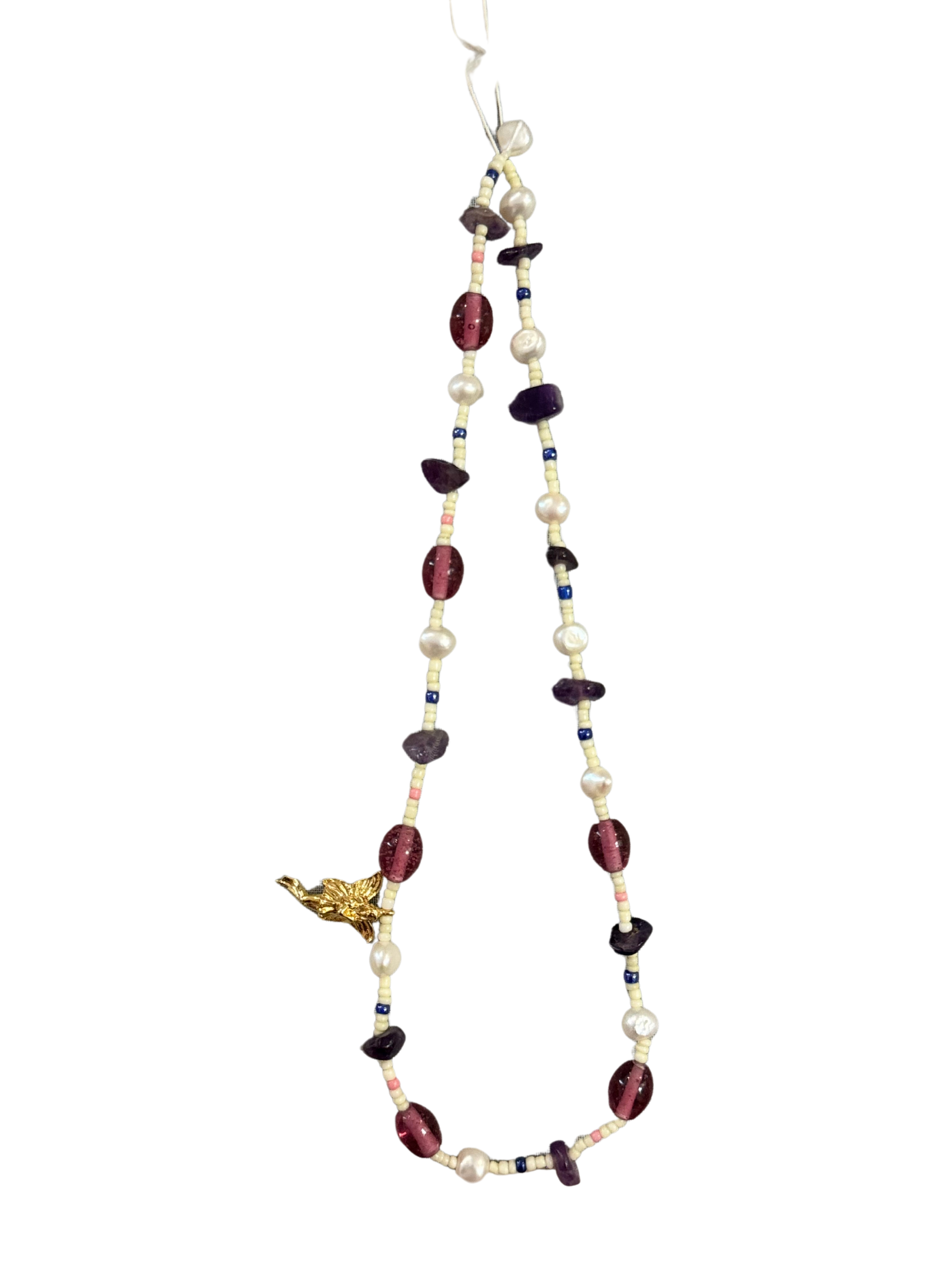 • Adorned with violet-toned glass beads, amethyst crystal chips, creamy freshwater pearls, and miniature vintage seed beads in soft ivory and blush