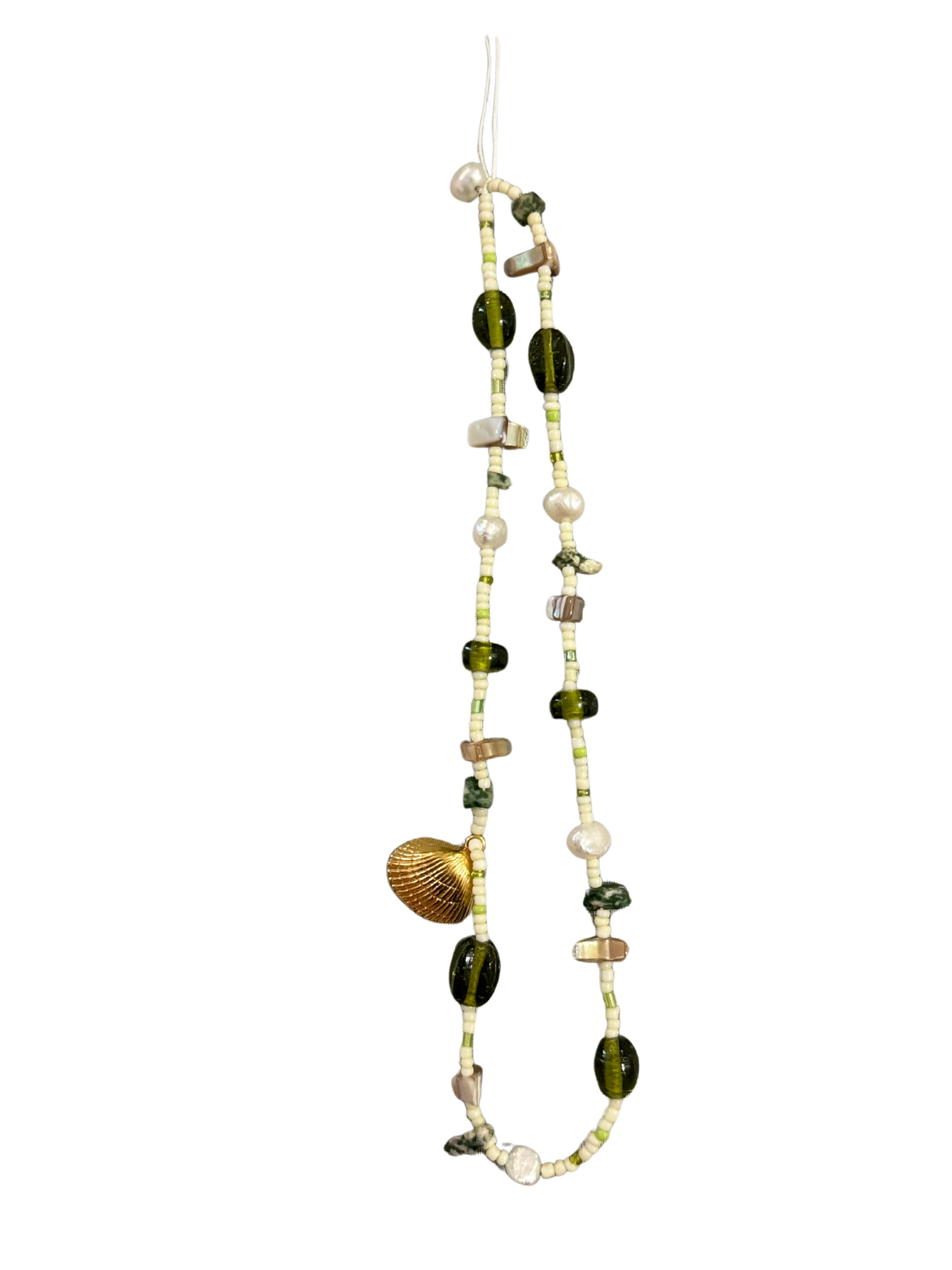 • Features earthy green glass beads, natural stone chips, creamy freshwater pearls, and pale yellow vintage seed beads