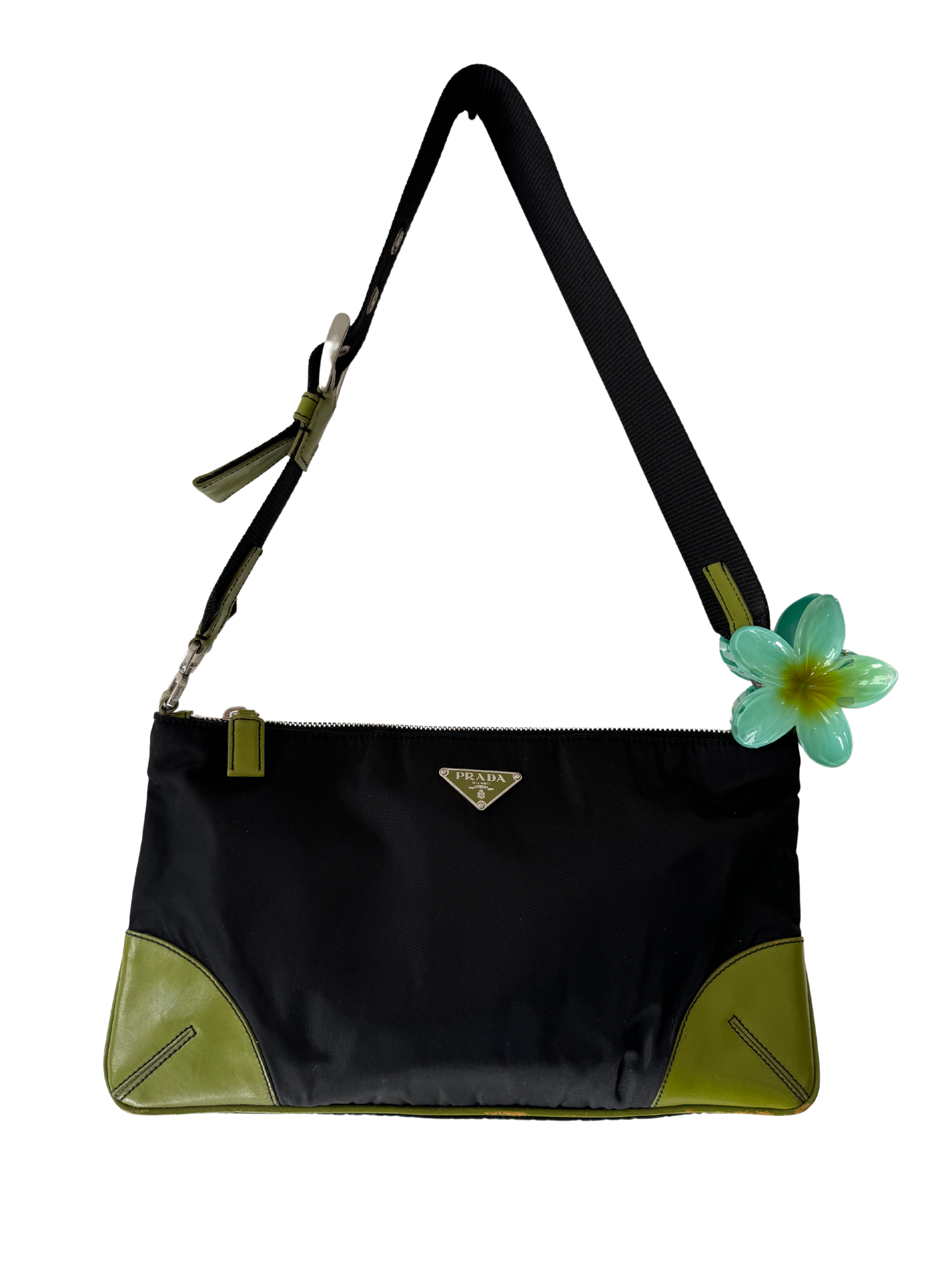 PRADA BLACK TESSUTO SHOULDER BAG WITH ACID GREEN LEATHER TRIM