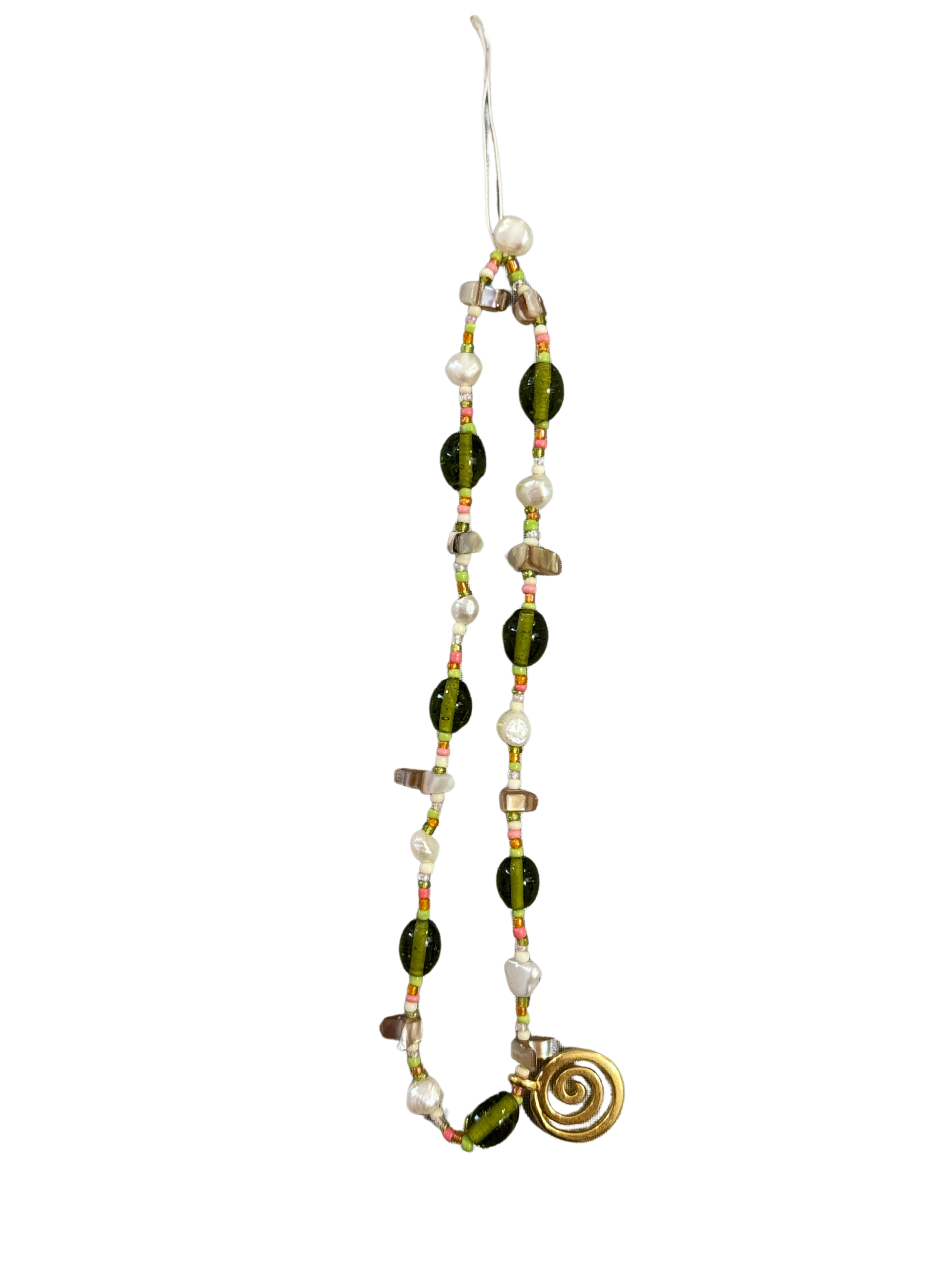 • Features a grounded mix of olive green glass beads, freshwater pearls, natural coral pieces, and soft pink seed beads